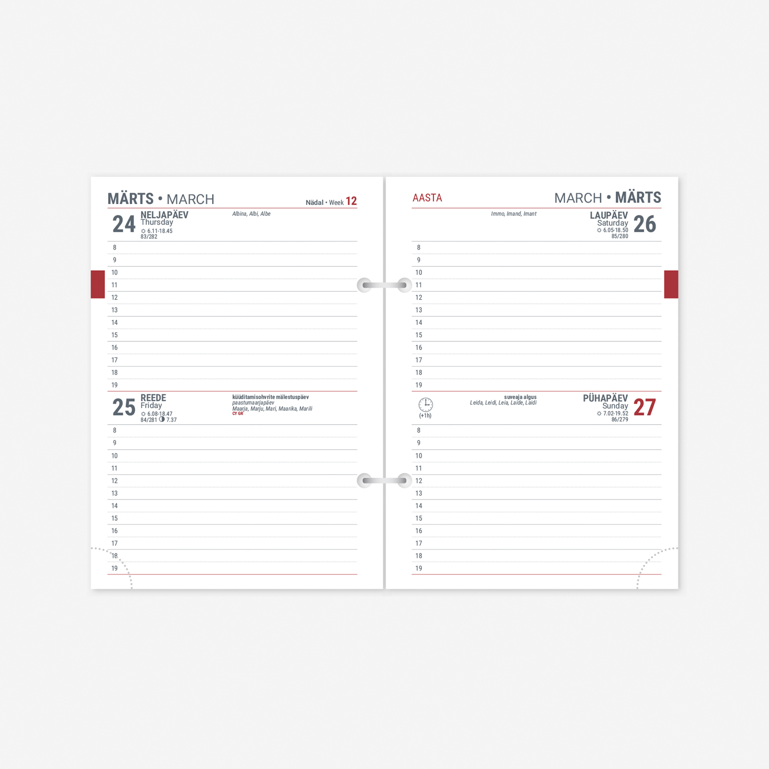 riigipühad, riiklikud tähtpäevad, lipu- ja nimepäevad, 37 riigi riigipühad lühenditega, päikese tõusu ja loojangu kellaajad (Tallinn), suve- ja talveajale üleminek, kuu faasid kellaaegadega, sodiaagimärgid, kaduneljapäev, päevaloend, minikalender, nädala number, aastaaegade algused kellaaegadega. Lisalehtedel isiklikud andmed, tabelkalender, aastaplaan, puhkuse planeerija, kontaktid, märkmed, maailma ajad, mõõtühikute teisendamine, kalendri legend.